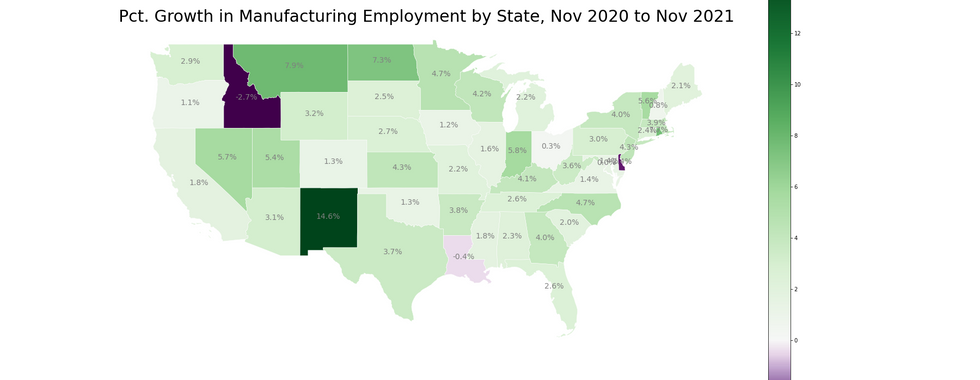 Hawaii and Nevada experienced the largest state level gains in employment from October 2020 to October 2021. Growing 10.5 and 7.6 percent respectively. The tourism and hospitality industries had been hit hard by travel restrictions during that time and both of those states rely heavily on those industries. Since then, employment in those industries have substantially recovered.